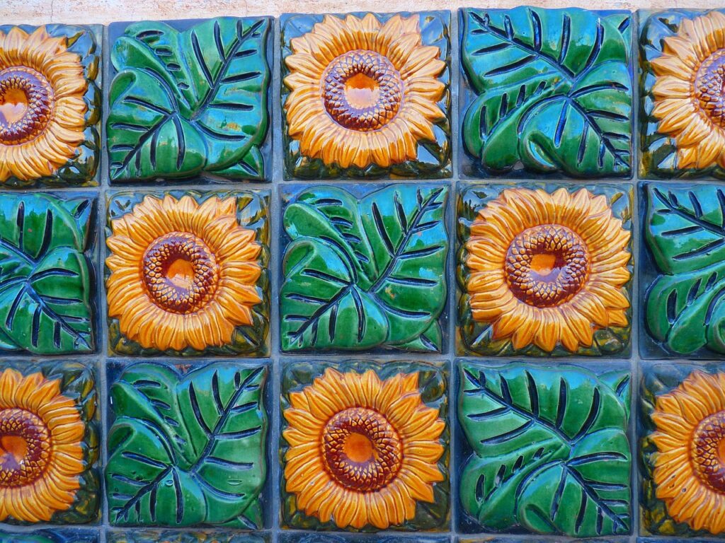 こちらは、夏の活気を思わせる満開のひまわりと青々とした葉のタイル。